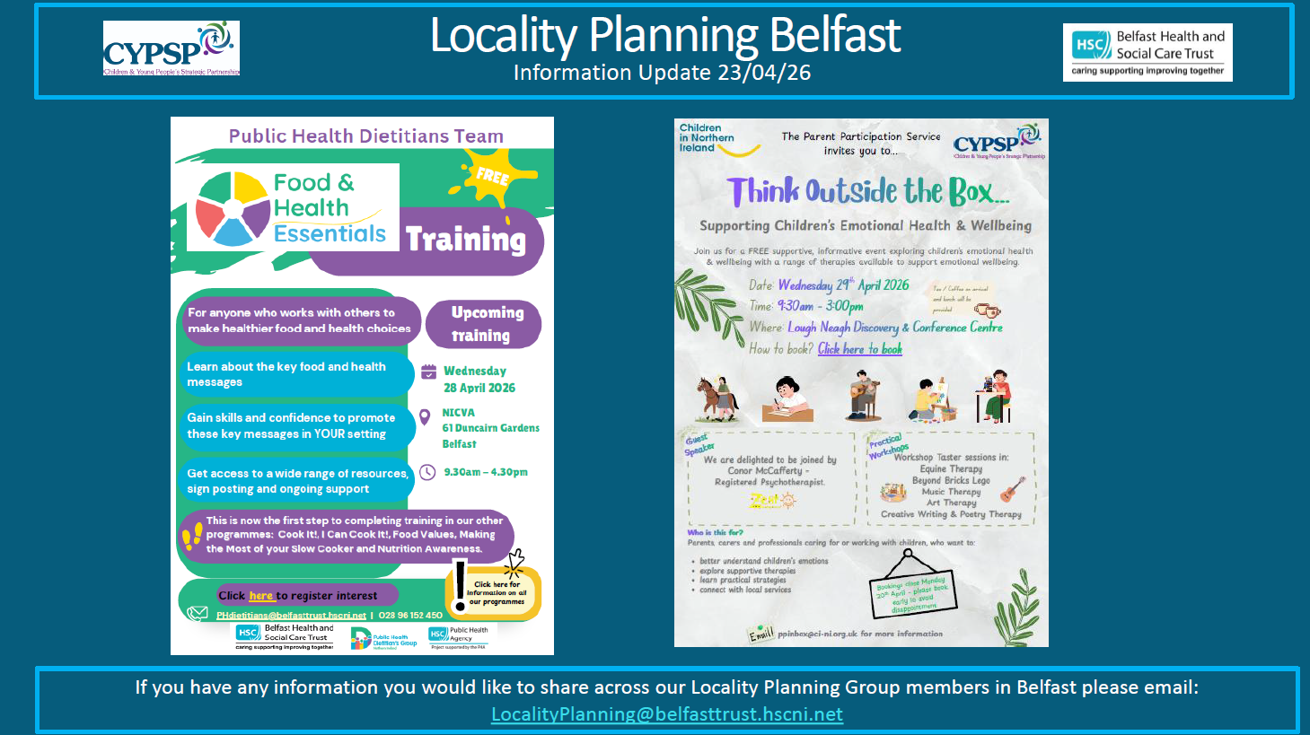 Graphic titled ‘Locality Planning Belfast – Information Update 23/04/26’ with CYPSP and Belfast Health and Social Care Trust logos. The image features two event posters: one promoting free ‘Food & Health Essentials’ training by the Public Health Dietitians Team, including date, location and registration details, and another advertising a free workshop titled ‘Think Outside the Box – Supporting Children’s Emotional Health & Wellbeing’, with illustrations of children and information on event date, venue and booking.