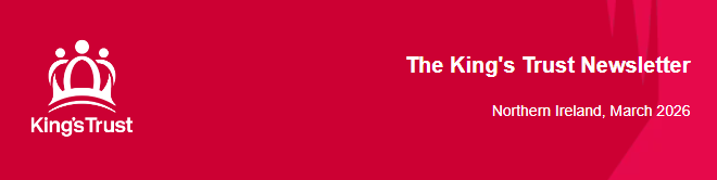 Red banner featuring the King’s Trust logo on the left, showing a white stylised crown with three circular figures above it. To the right, white text reads ‘The King’s Trust Newsletter’ and below it ‘Northern Ireland, March 2026’